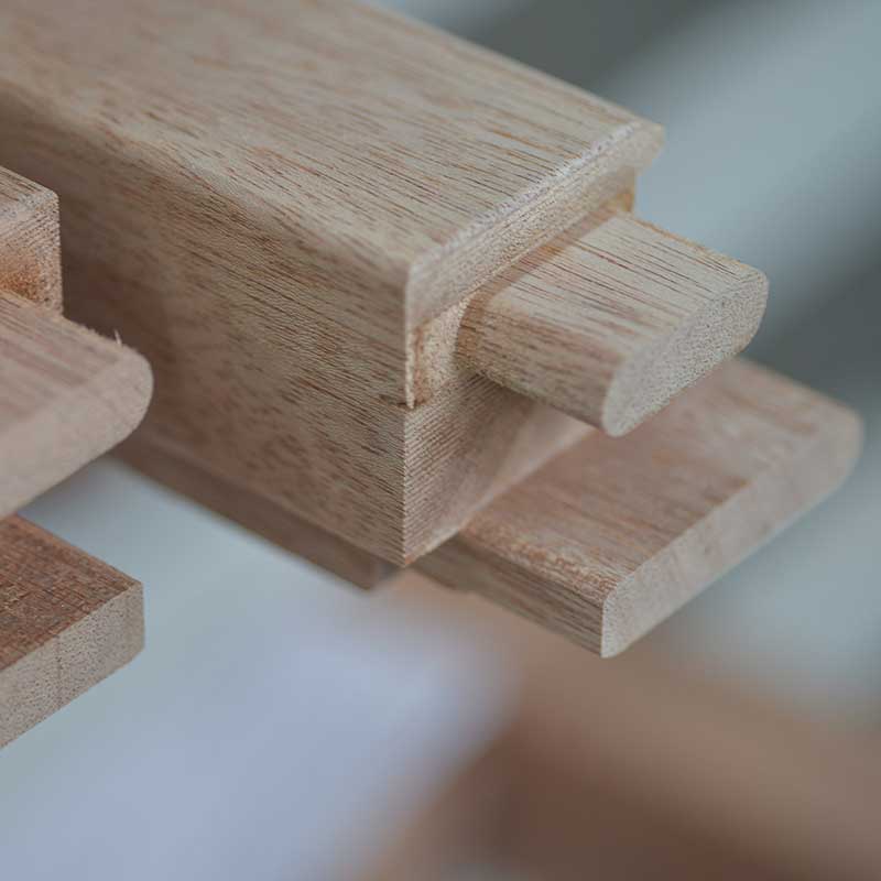 Der gerundete Zapfen wird mit moderner CNC Technik direkt aus dem Werkstück gefräst. Im Gegenstück geschieht das gleiche mit dem zugehörigen Langloch. Die Eckverbindung zieht sich durch dieses Detail automatisch fest und sorgt für maximale Festigkeit und Stabilität auch bei sehr hohen und schweren Elementen.